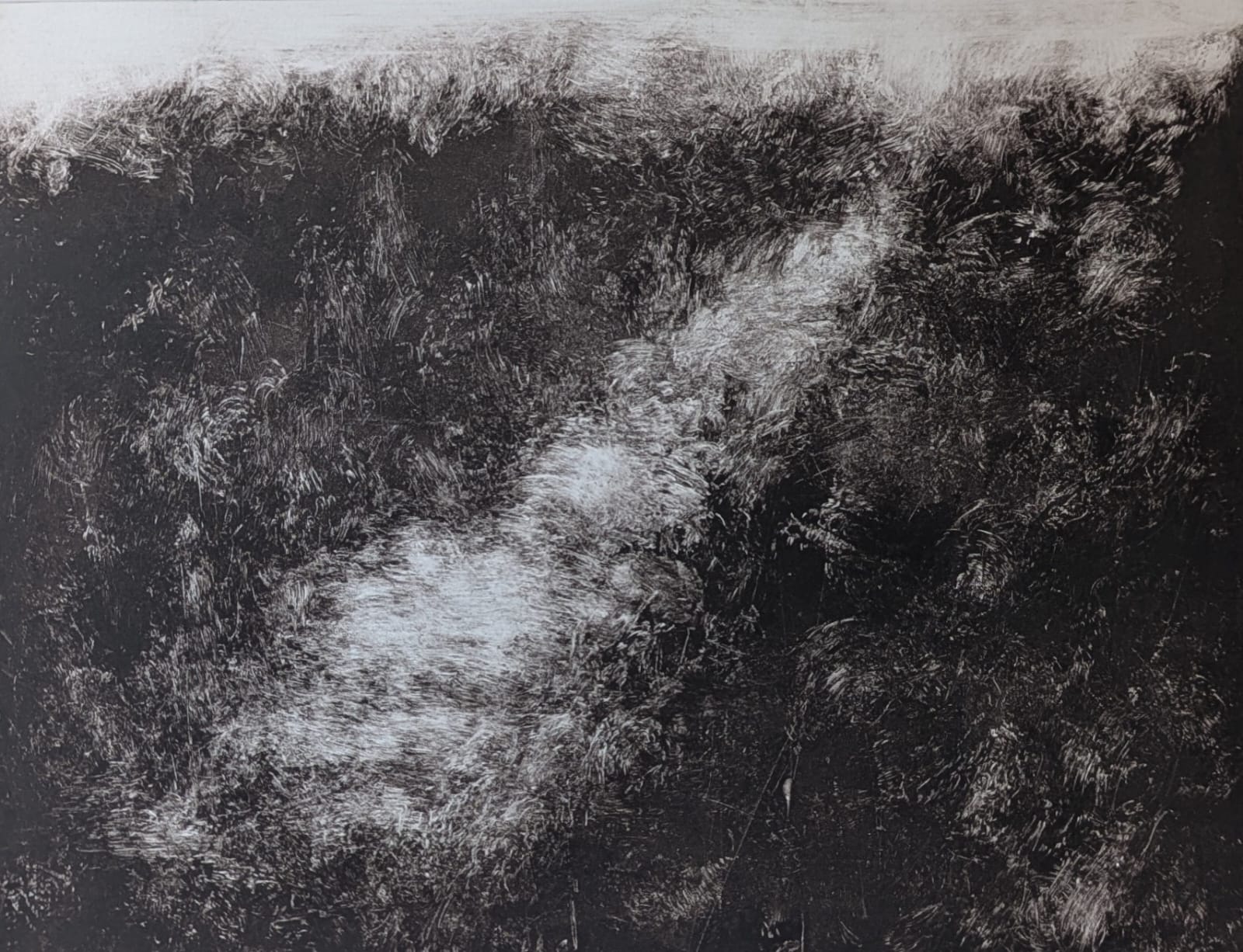 Dans un atelier cherbourgeois elle s’est initiée à l’estampe à travers la technique du monotype et crée des œuvres qui se situent à la frontière entre dessin, peinture et gravure. Cette technique, qui consiste à travailler directement la matière sur une plaque avant l’impression, permet de créer des effets de texture riches et variés. Dans cette série de monotypes, Anna Perjan nous invite à découvrir des œuvres en noir et blanc d’une grande expressivité. Ses compositions sont marquées par des contrastes entre ombre et lumière, des mouvements fluides et des jeux de matière évocateurs. On y trouve une vraie liberté dans le geste, visible à travers les traces énergiques, les effets de grattage et les zones plus ou moins denses qui donnent de la profondeur à chaque œuvre. Chaque monotype est unique et porte en lui la spontanéité du moment de création. En noir et blanc, Anna Perjan se concentre sur l’essentiel : le mouvement, la texture, la lumière. C’est un travail sensible qui laisse place à l’imagination du spectateur.